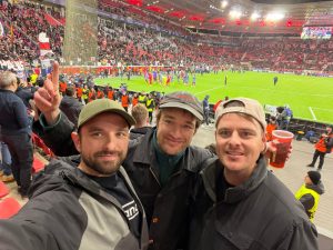 Het getuigde hier en daar van PVV aanwezigheid en Nazi sympathie. Enfin, na een matige wedstrijd (2-0 overwinning Roda JC) brachten Kaj en Ivar de nacht door in het rustieke Kerkrade. Dinsdag op pad naar Keulen, waar Bo-Peter, die inmiddels onderweg was met de trein (kedeng kedeng), zich bij hen zou voegen. Nou, toen was een Biergarten voor de wedstrijd zo gevonden! De wedstrijd zelf was spectaculair, zachtjes uitgedrukt; rode kaarten, penalty’s en maar liefst 9 doelpunten, waarvan 7 tegen oranje doelman Mark Flekken.