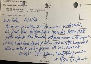 (Foto genomen van de TV). De uitzending werd voor mij onvergetelijk omdat ik wegens een opmerking van Carrie Tefsen het voorgenomen huwelijk tussen Astrid en mij in de ether kon slingeren. Jan Lenferink stelde het huwelijk als vraag centraal, waarop Carrie Tefsen meldde ‘dat se dat echt niet sag sitte’. Toen was het mijn beurt: ‘in plaats van kaarten…….’, je begrijpt het, geginnegap alom. Het leuke was dat Lenferink oprecht geïnteresseerd raakte in Book One en er best wel in wilde investeren. Hij stuurde me daar nog een alleraardigste ansichtkaart over:
