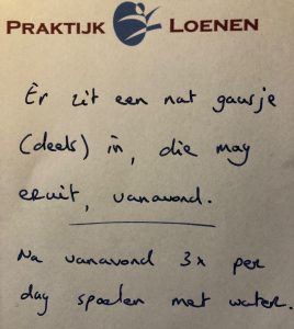 Ze instrueerde me een afspraak te maken met onze huisarts die volgens haar waarschijnlijk anti biotica toe zou dienen. Muziek in mijn oren; geen geknijp meer. Zo gezegd zo gedaan, ik heb een geweldige huisarts, tevens voetballiefhebber. Allereerst gaf hij een compliment voor het voorwerk van Astrid, met dien verstande dat de prikgaatjes niet voldoende waren en dat hij het abces open zou snijden. ‘Verdoving’, piepte ik. ‘Ja, maar het zal niet veel helpen vanwege de infectie’, antwoordde hij monter. ‘Oh’, was het enige dat ik uit kon brengen. Na het sneetje werd het restantje vuil eruit gehaald en tandenknarsend (held outdoor) kon ik toch op enig moment een hartgrondig ‘shit’ niet voorkomen. Toen de procedure voltooid was (de hemel ging open) vroeg ik hem wat er mis was met de pijnloze anti biotica kuur. ‘Het natuurlijke proces heeft de voorkeur’, was het korte antwoord. ‘Logisch’, beaamde ik schaapachtig. Vervolgens schreef hij een briefje voor Astrid, nu benoemd tot assistent, wat er gedaan moest worden: